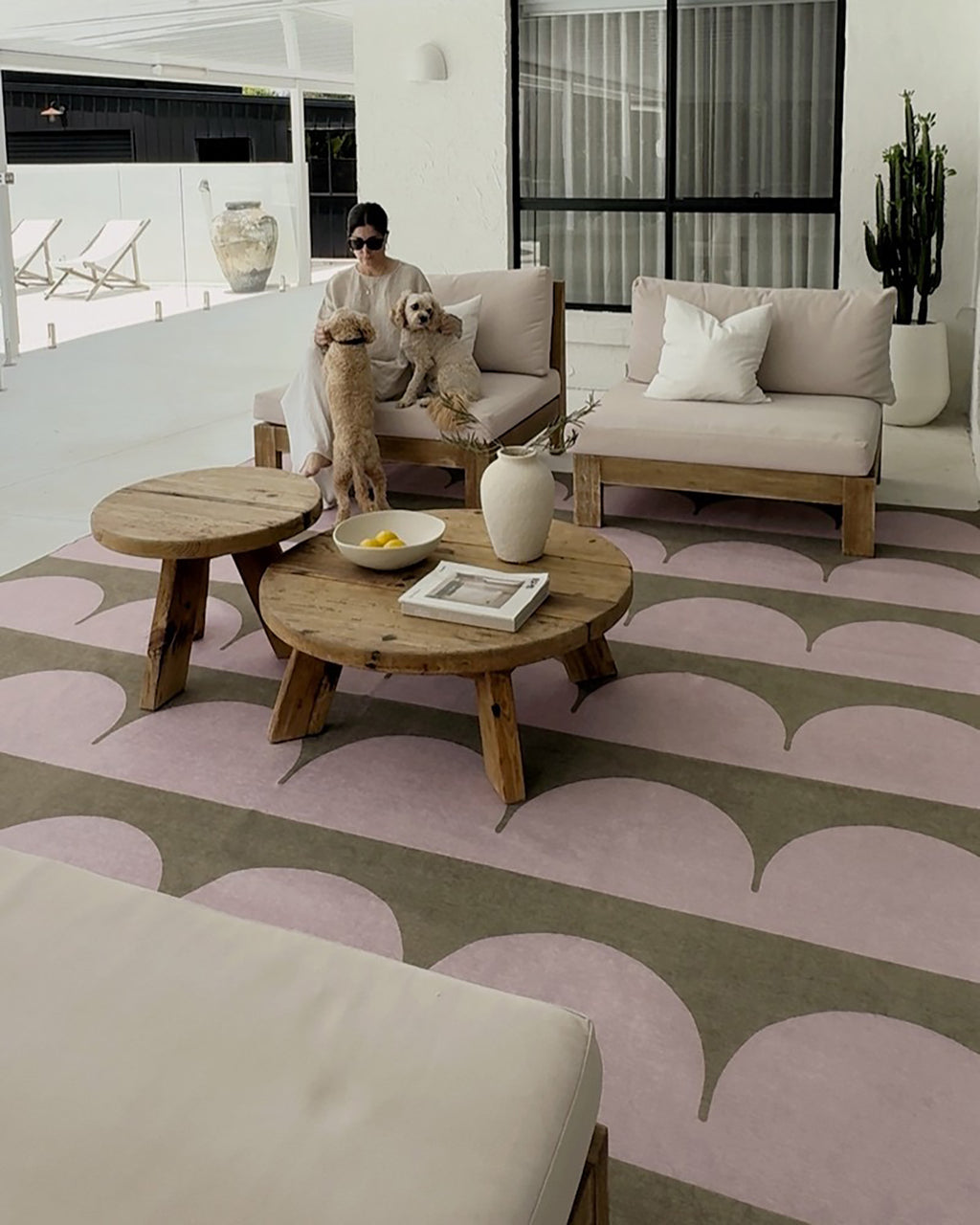 Cleo is a contemporary blush and sage indoor outdoor rug featuring a playful arch stripe design.