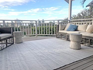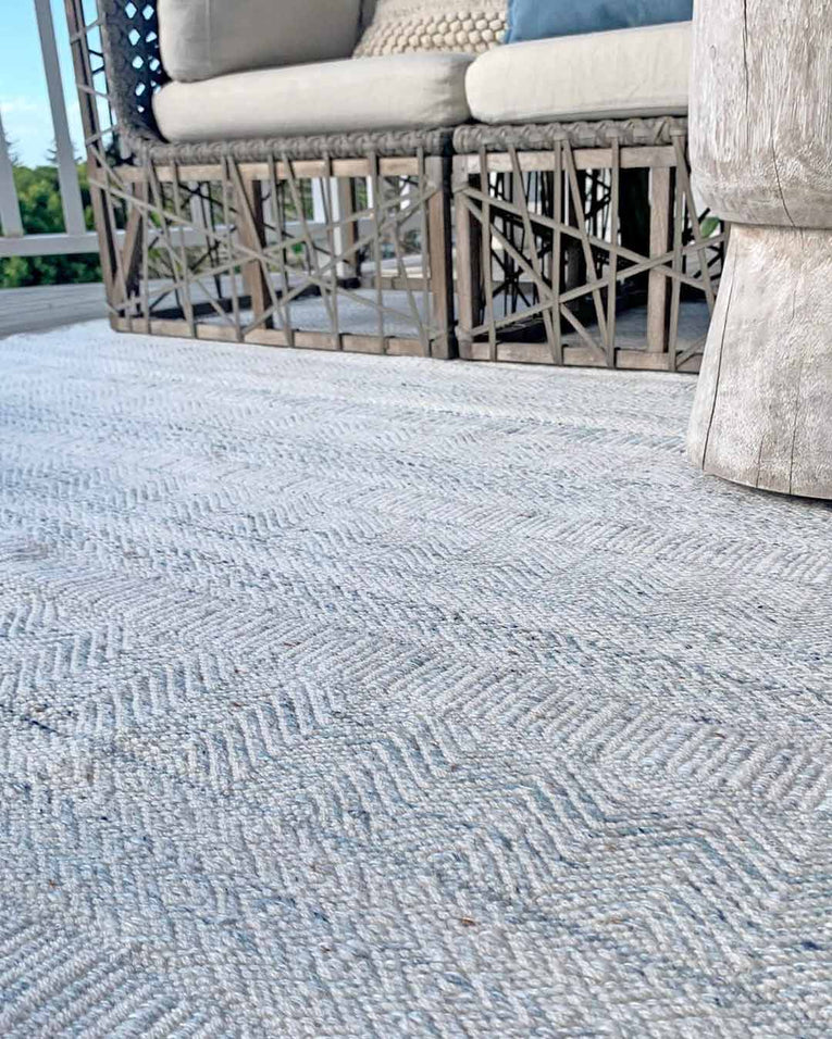 Define your alfresco area as you would indoors. Keep the front legs of outdoor furniture on the rug to frame the setting.