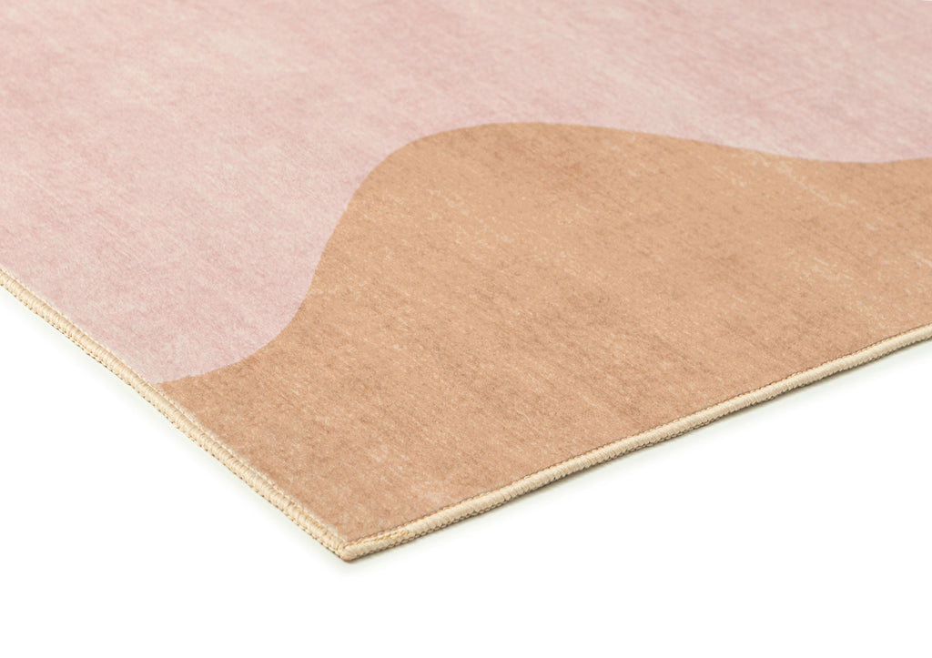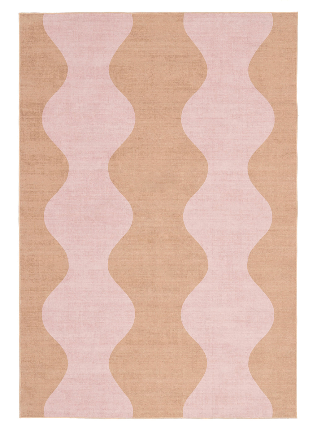 Zamora is a washable and foldable rug defined by a flowing wave motif that brings a sense of movement and softness to a space. A warm beige base is layered with soft pink curves, creating a rhythmic pattern that adds movement and visual interest to the space.